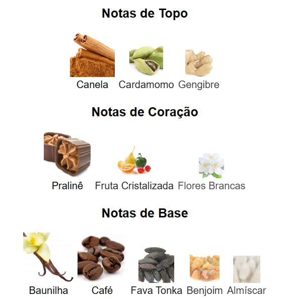 As notas de fundo são: Baunilha, Café, Fava Tonka, Benjoim e Almíscar.
