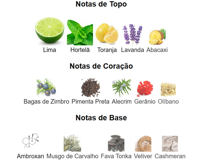 As notas de coração são: Bagas de Zimbro, Pimenta Preta, Alecrim, Gerânio e Olíbano.