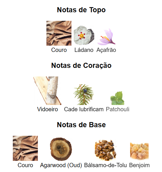 As notas de fundo são: Couro, Agarwood (Oud), Bálsamo-de-Tolu e Benjoim.